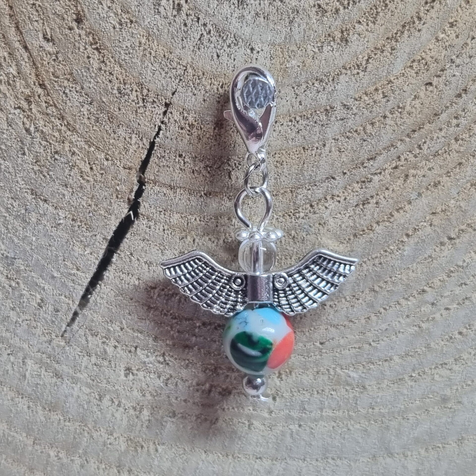 Dit geluksengeltje heeft een ronde witte 8 mm kraal met groene, blauwe, rode, zwarte en roze accenten als buik en transparante 4 mm kraal als hoofdje. Het geluksengeltje is verder in zilverkleurig metaal afgewerkt.