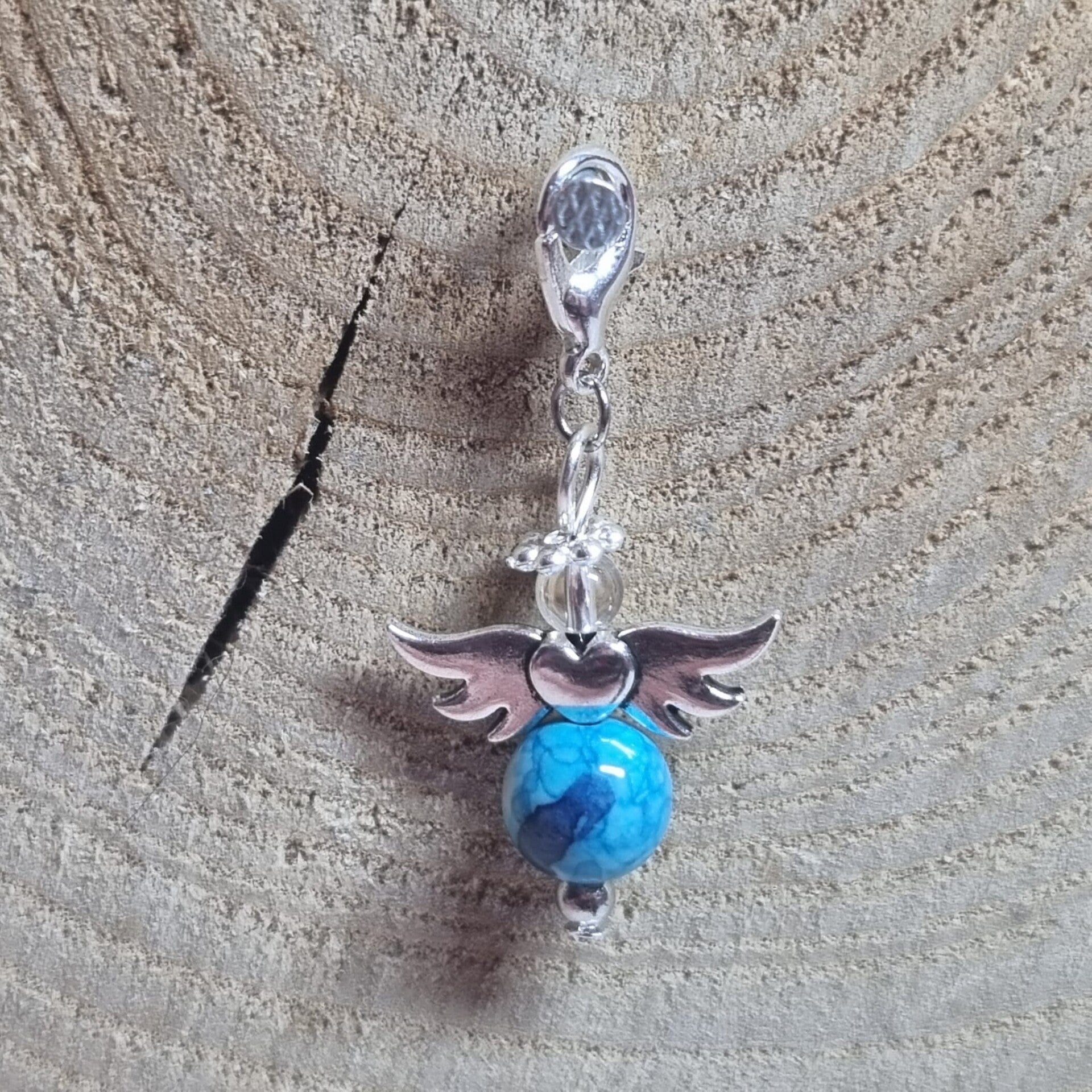 Dit geluksengeltje heeft een ronde 8 mm kraal met witte en licht en donker blauwe accenten als buik en transparante 4 mm kraal als hoofdje. Het geluksengeltje is verder in zilverkleurig metaal afgewerkt.