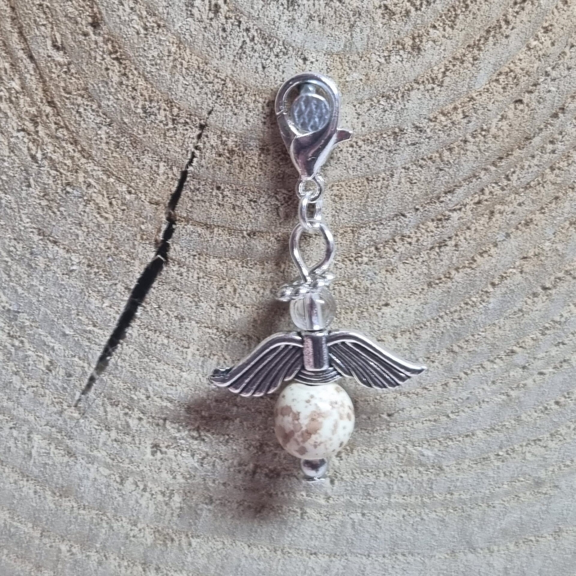 Dit geluksengeltje heeft een ronde beige 8 mm kraal met bruine accenten als buik en transparante 4 mm kraal als hoofdje. Het geluksengeltje is verder in zilverkleurig metaal afgewerkt.