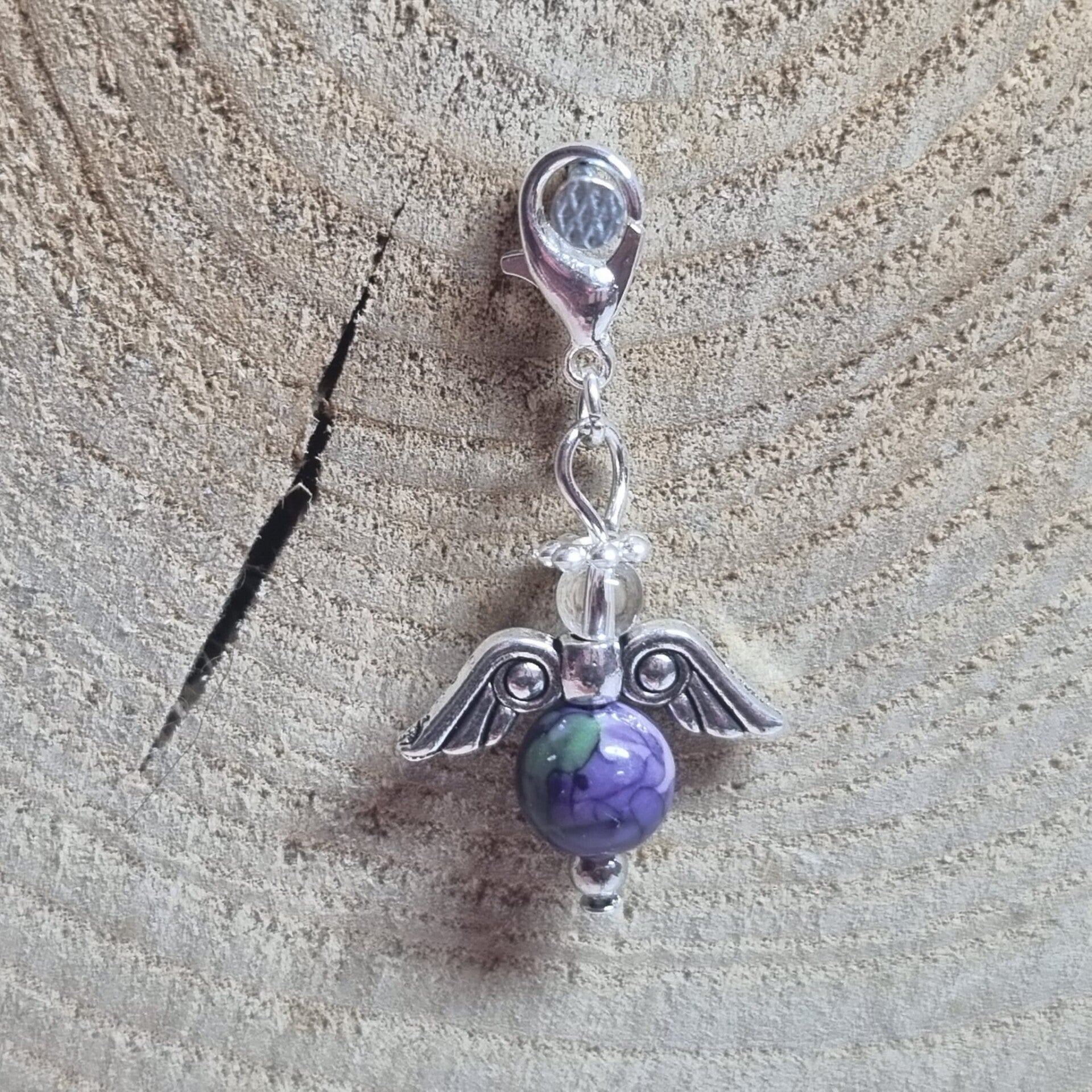 Dit geluksengeltje heeft een ronde 8 mm kraal met groen en paars als buik en transparante 4 mm kraal als hoofdje. Het geluksengeltje is verder in zilverkleurig metaal afgewerkt.