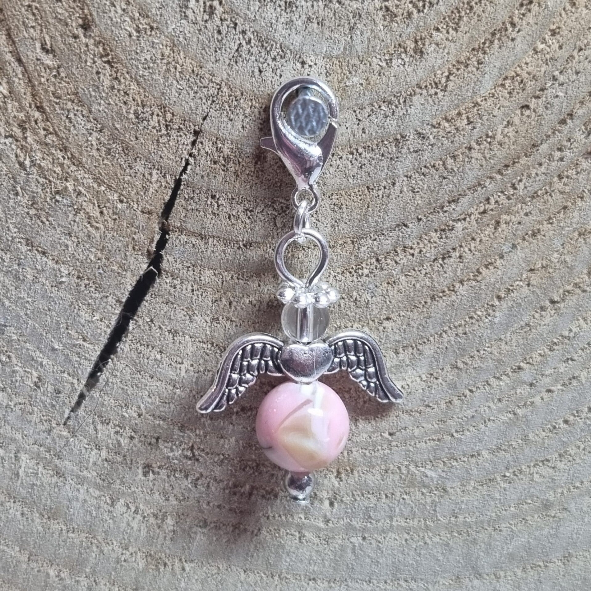 Dit geluksengeltje heeft een ronde licht roze 8 mm kraal met beige, zwarte en roze accenten als buik en transparante 4 mm kraal als hoofdje. Het geluksengeltje is verder in zilverkleurig metaal afgewerkt.