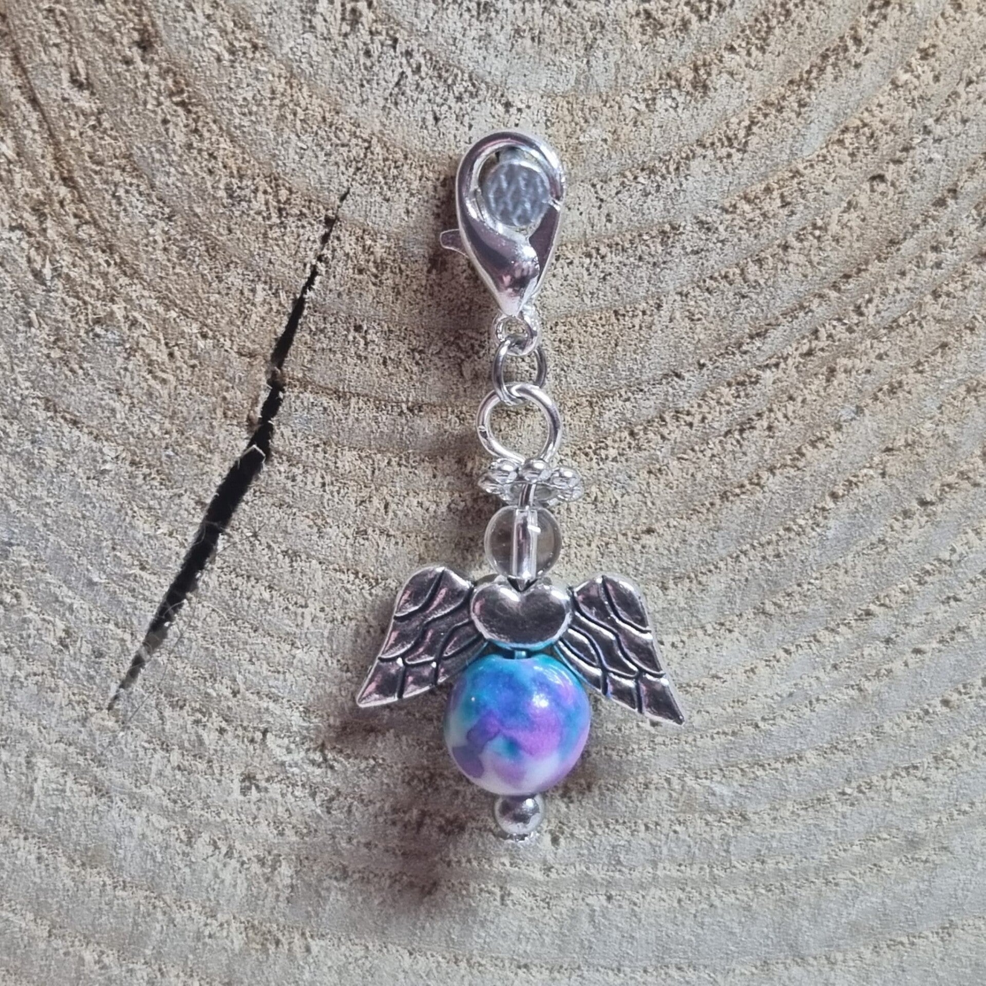 Dit geluksengeltje heeft een ronde witte 8 mm kraal met turquoise en roze accenten als buik en transparante 4 mm kraal als hoofdje. Het geluksengeltje is verder in zilverkleurig metaal afgewerkt.