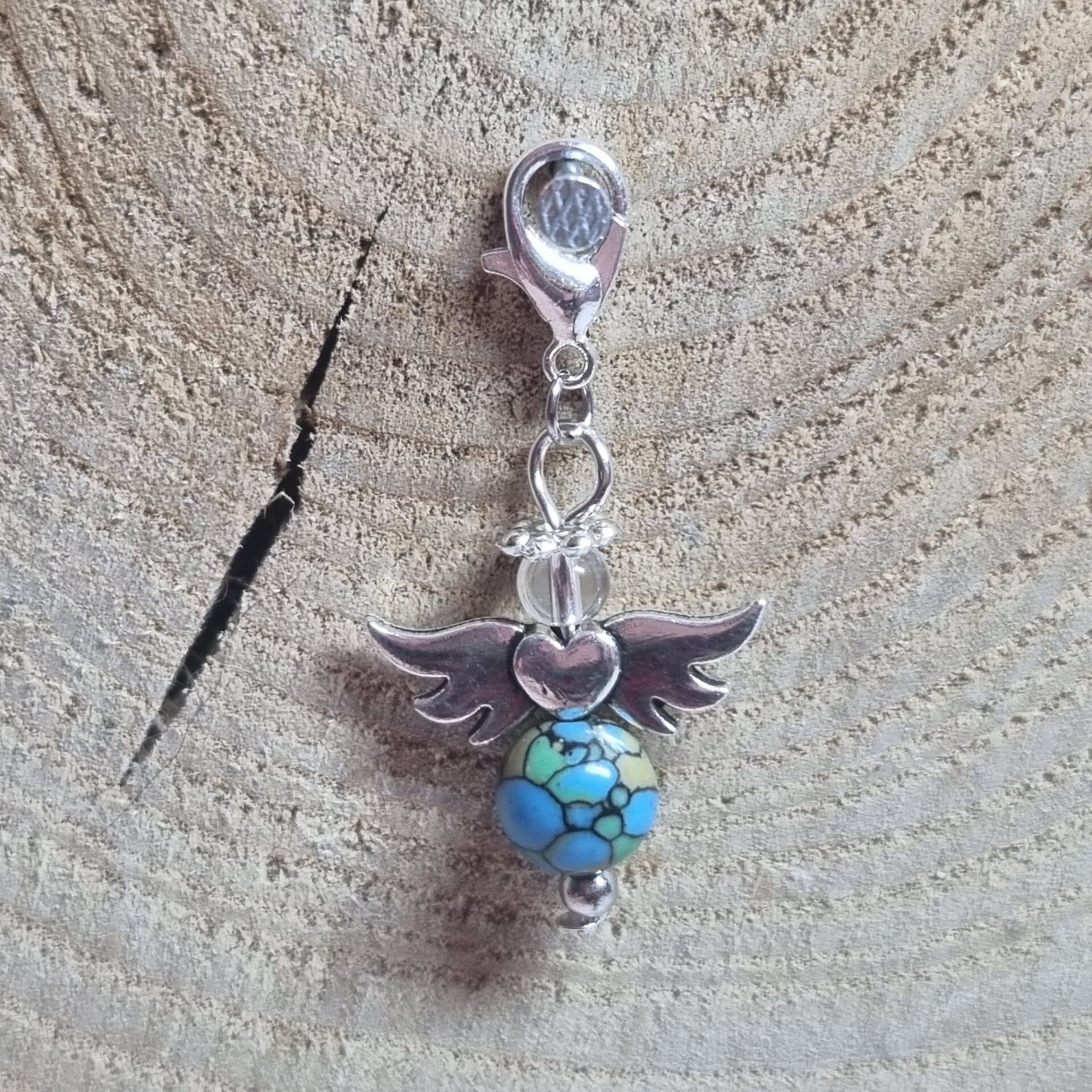 Dit geluksengeltje heeft een ronde 8 mm kraal met blauw, mint, beige en zwart als buik en transparante 4 mm kraal als hoofdje. Het geluksengeltje is verder in zilverkleurig metaal afgewerkt.