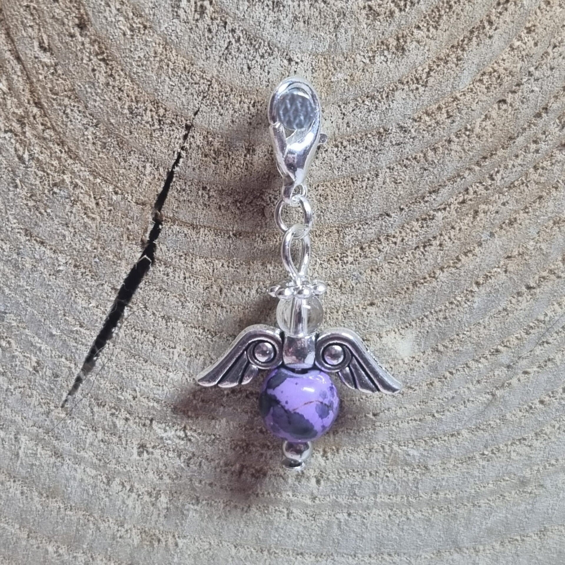 Dit geluksengeltje heeft een ronde paarse 8 mm kraal met zwarte accenten als buik en transparante 4 mm kraal als hoofdje. Het geluksengeltje is verder in zilverkleurig metaal afgewerkt.