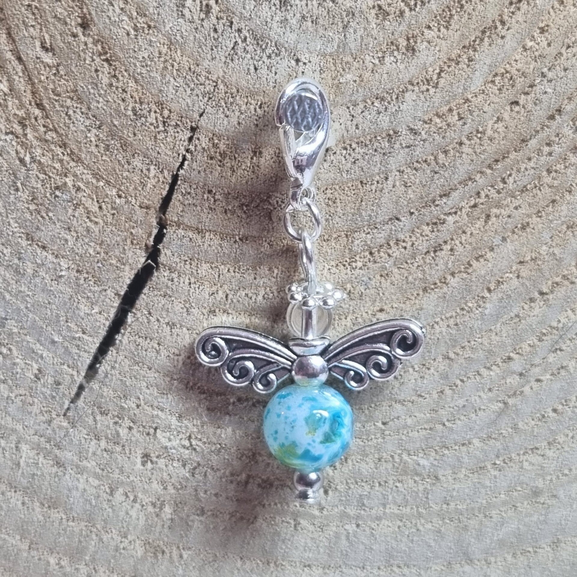 Dit geluksengeltje heeft een ronde transparante 8 mm kraal met witte, turquoise en gele accenten als buik en transparante 4 mm kraal als hoofdje. Het geluksengeltje is verder in zilverkleurig metaal afgewerkt.