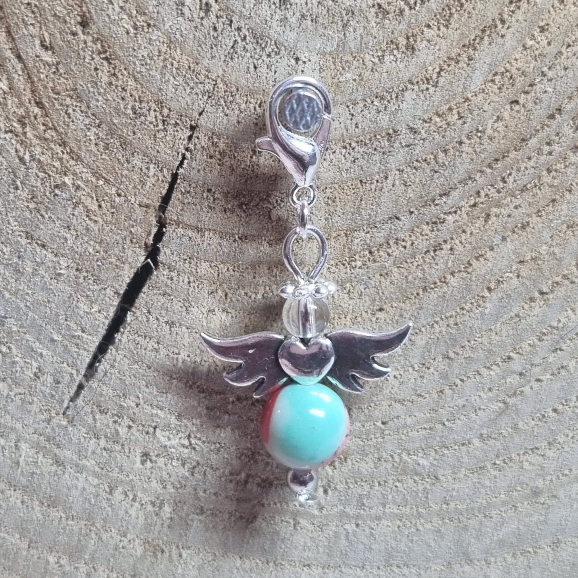 Dit geluksengeltje heeft een ronde witte 8 mm kraal met mint, roze, rode en beige accenten als buik en transparante 4 mm kraal als hoofdje. Het geluksengeltje is verder in zilverkleurig metaal afgewerkt.