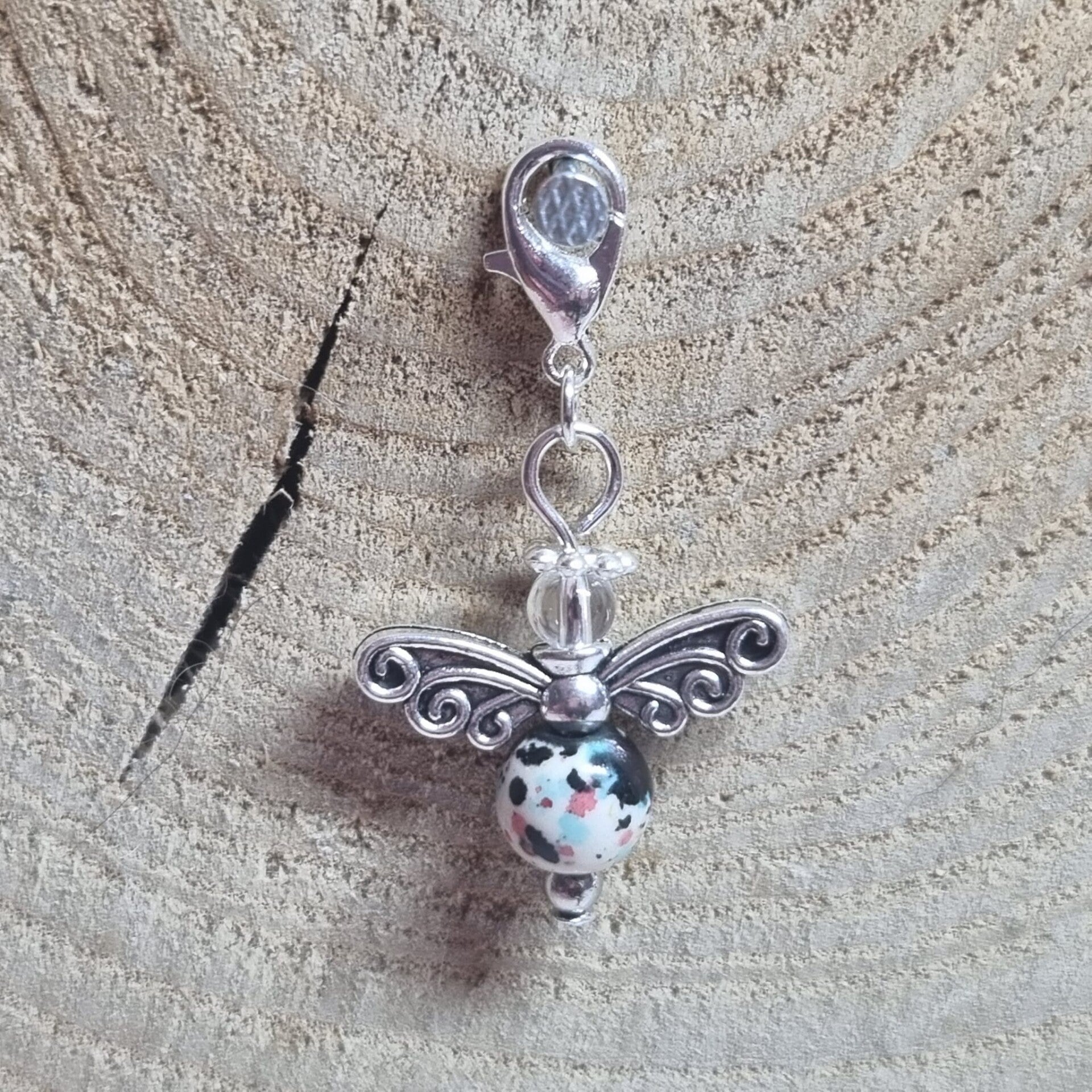 Dit geluksengeltje heeft een ronde witte 8 mm kraal met zwarte, rode en blauwe accenten als buik en transparante 4 mm kraal als hoofdje. Het geluksengeltje is verder in zilverkleurig metaal afgewerkt.