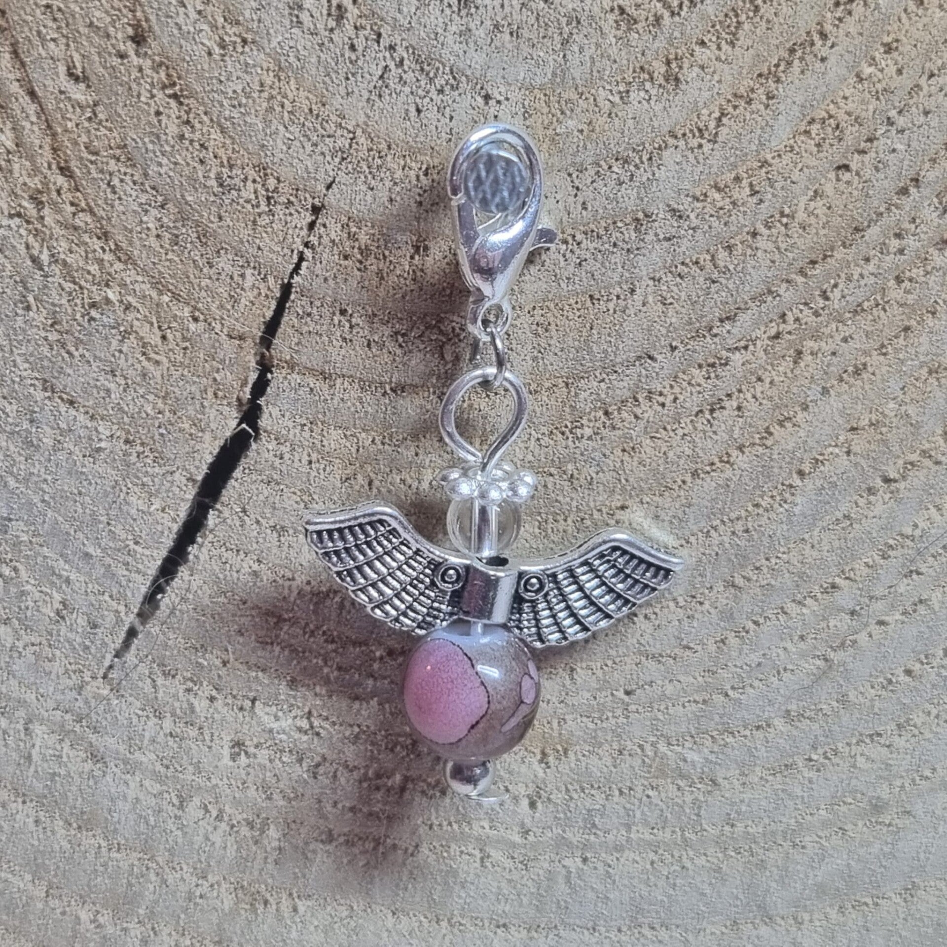 Dit geluksengeltje heeft een ronde transparante 8 mm kraal met roze, bruine en gouden accenten als buik en transparante 4 mm kraal als hoofdje. Het geluksengeltje is verder in zilverkleurig metaal afgewerkt.