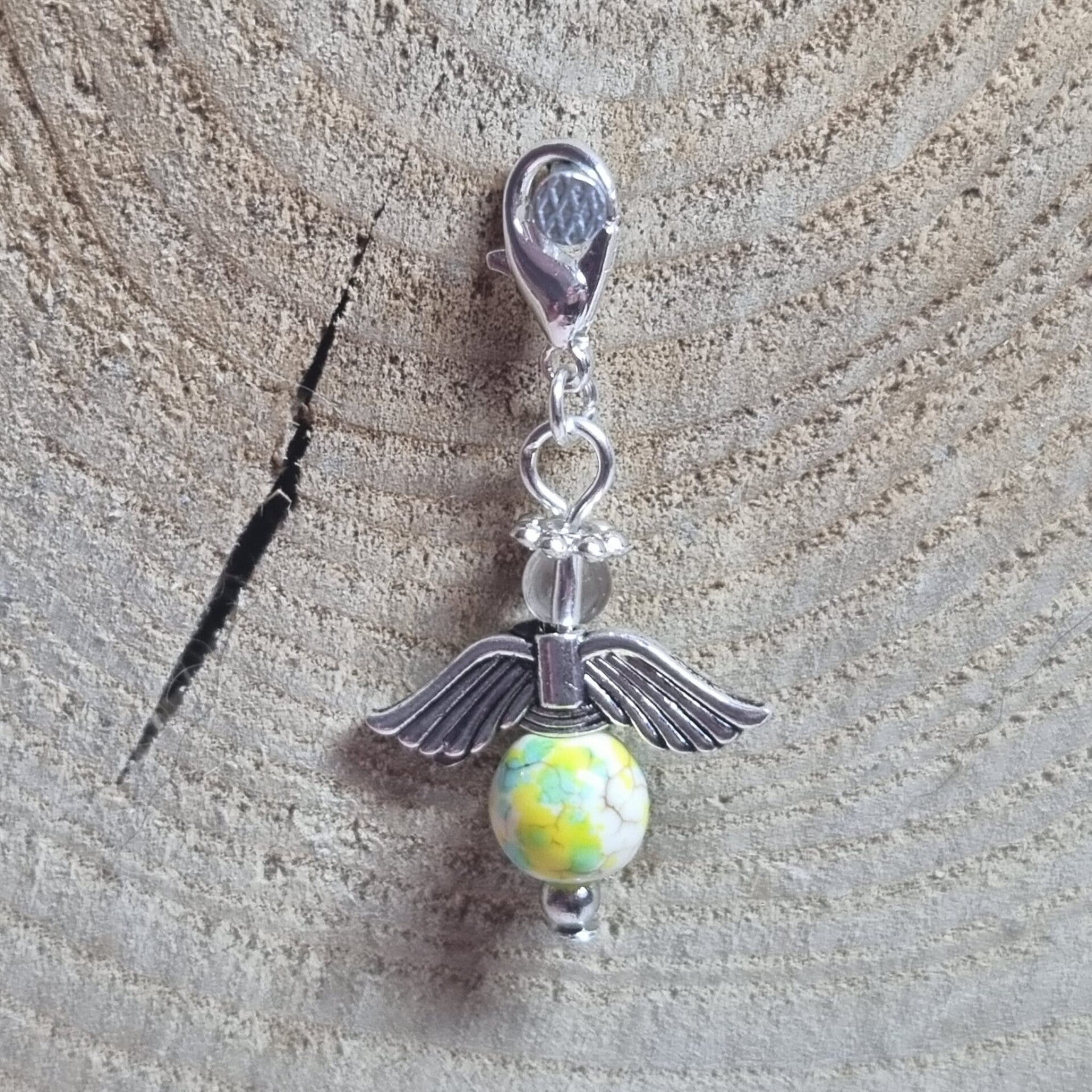 Dit geluksengeltje heeft een ronde witte 8 mm kraal met groene, gele en beige accenten als buik en transparante 4 mm kraal als hoofdje. Het geluksengeltje is verder in zilverkleurig metaal afgewerkt.