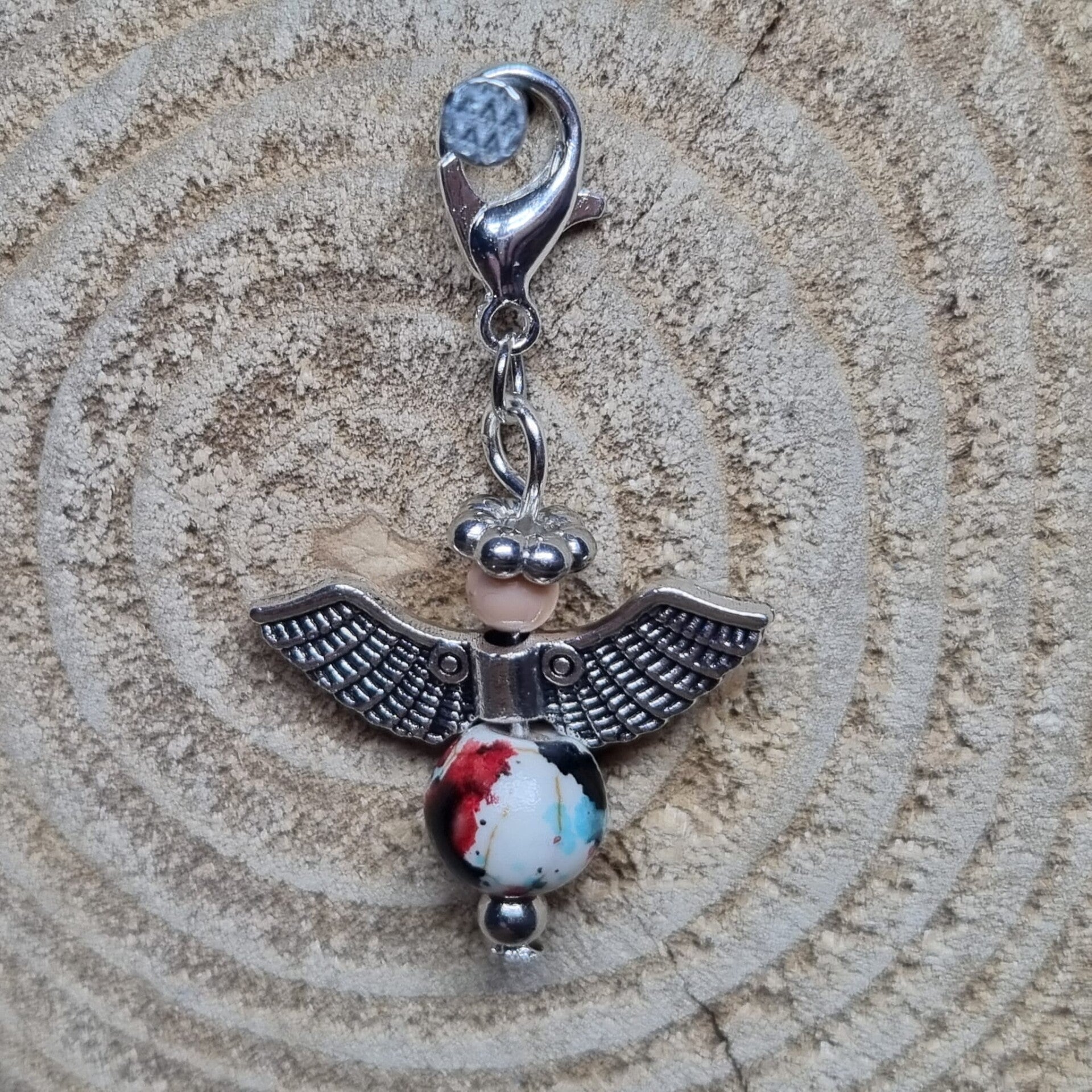 Dit geluksengeltje heeft een ronde 8 mm kraal met wit, zwart, rood, blauw en bruin als buik en een bruine 4 mm kraal als hoofdje. Het geluksengeltje is verder in zilverkleurig metaal afgewerkt.