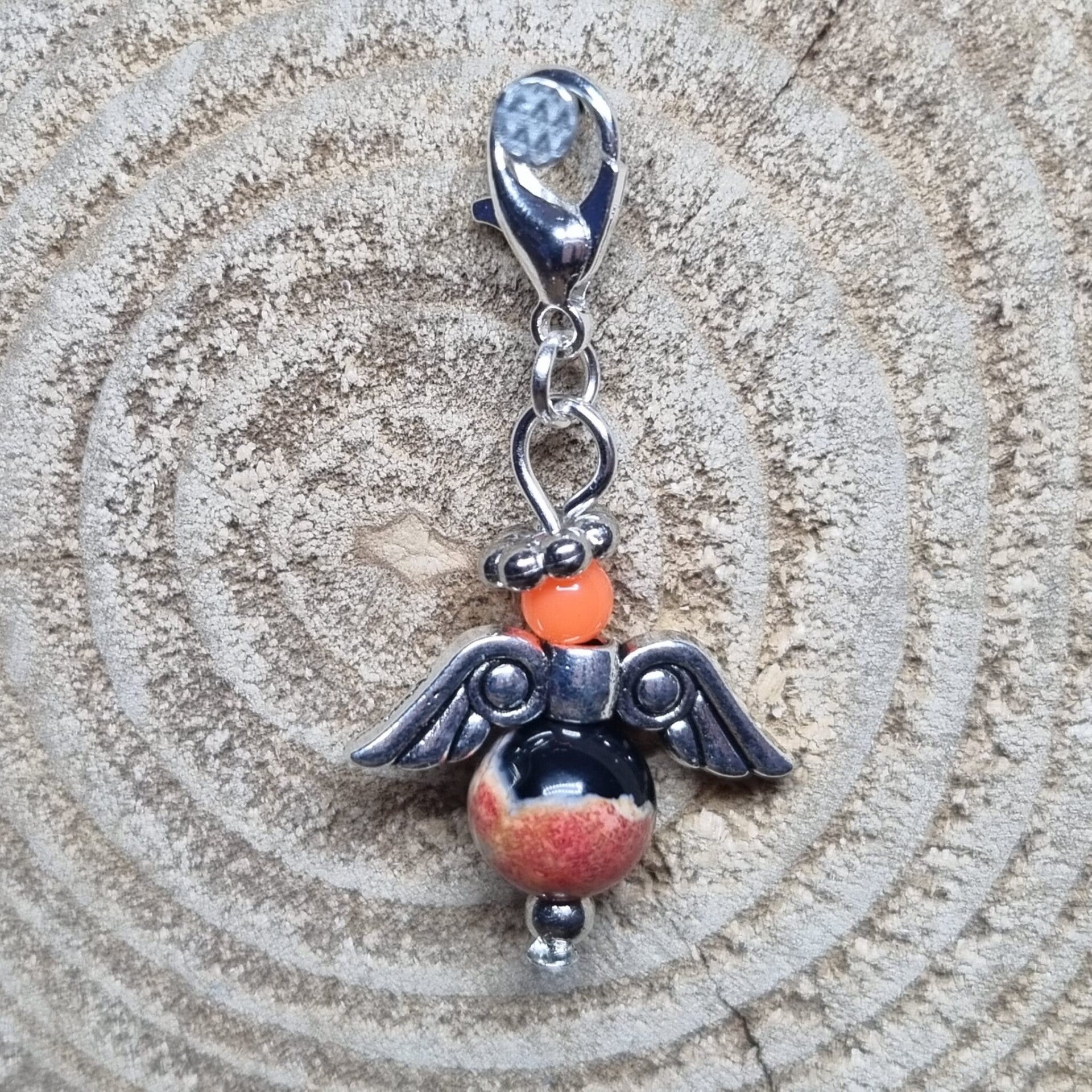 Dit geluksengeltje heeft een ronde 8 mm kraal met wit, oranje en zwart als buik en een oranje 4 mm kraal als hoofdje. Het geluksengeltje is verder in zilverkleurig metaal afgewerkt.