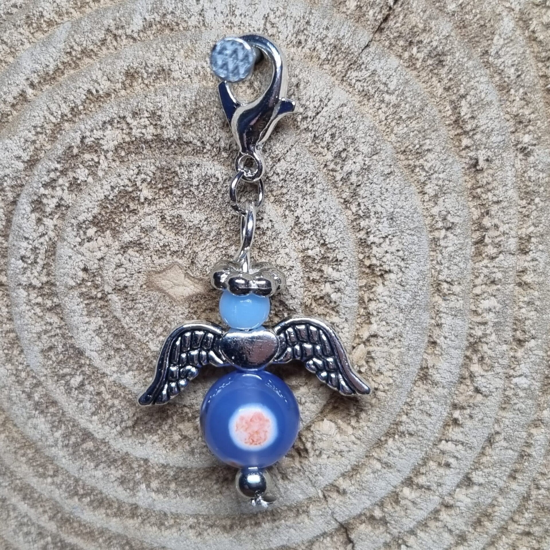 Dit geluksengeltje heeft een ronde 8 mm kraal met blauw, wit en oranje als buik en een blauwe 4 mm kraal als hoofdje. Het geluksengeltje is verder in zilverkleurig metaal afgewerkt.