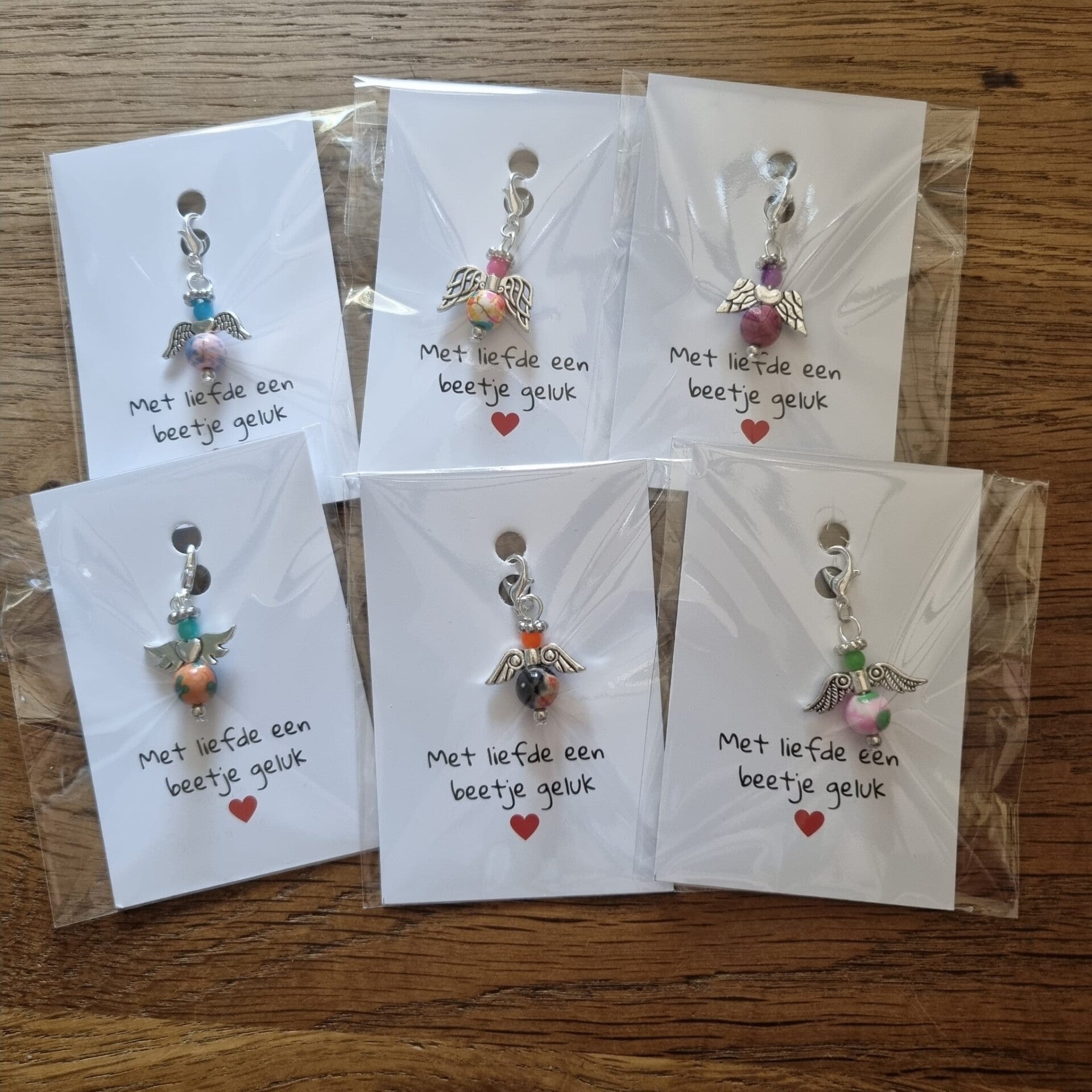 Het geluksengeltje hangt op een wit kaartje met de tekst "met liefde een beetje geluk" en wordt geleverd in een transparant zakje.