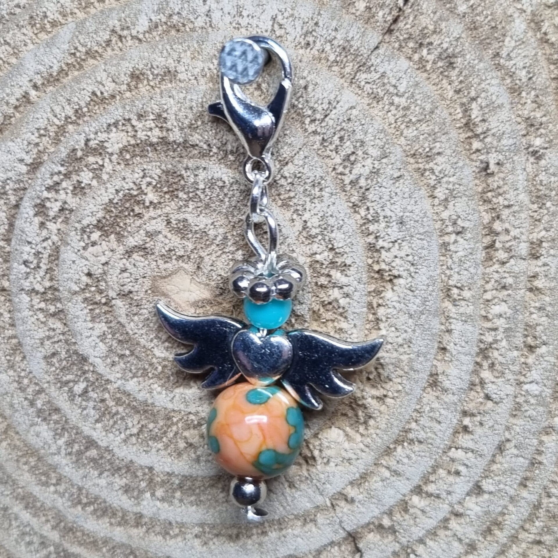 Dit geluksengeltje heeft een ronde 8 mm kraal met oranje en zeegroen als buik en een zeegroen 4 mm kraal als hoofdje. Het geluksengeltje is verder in zilverkleurig metaal afgewerkt.