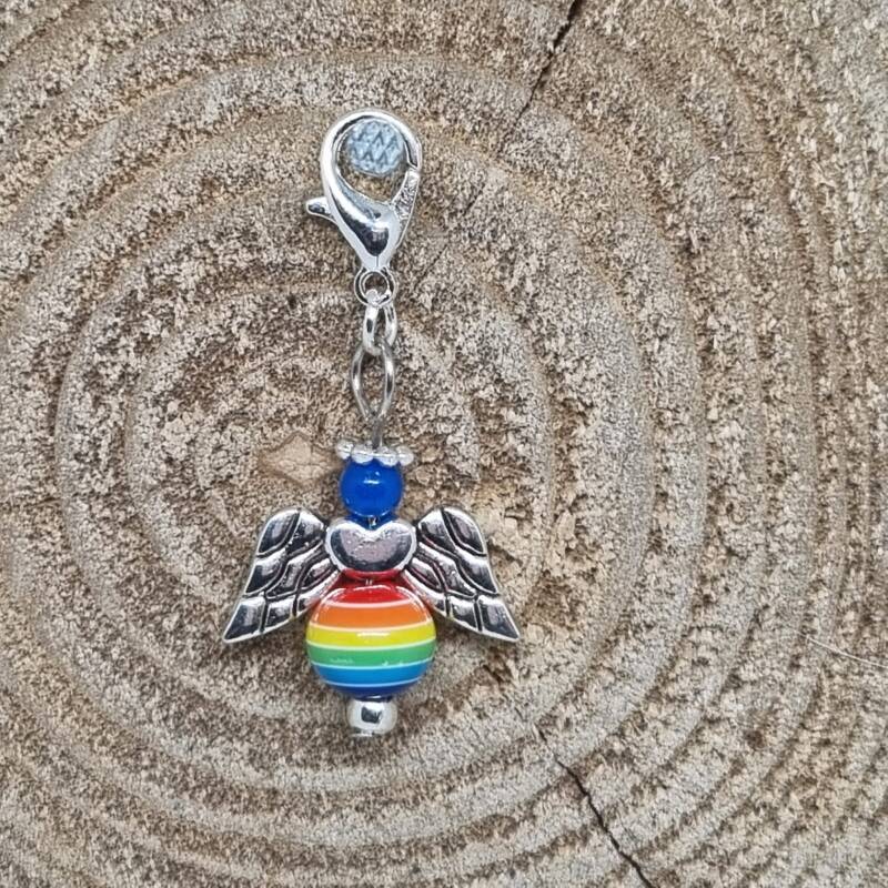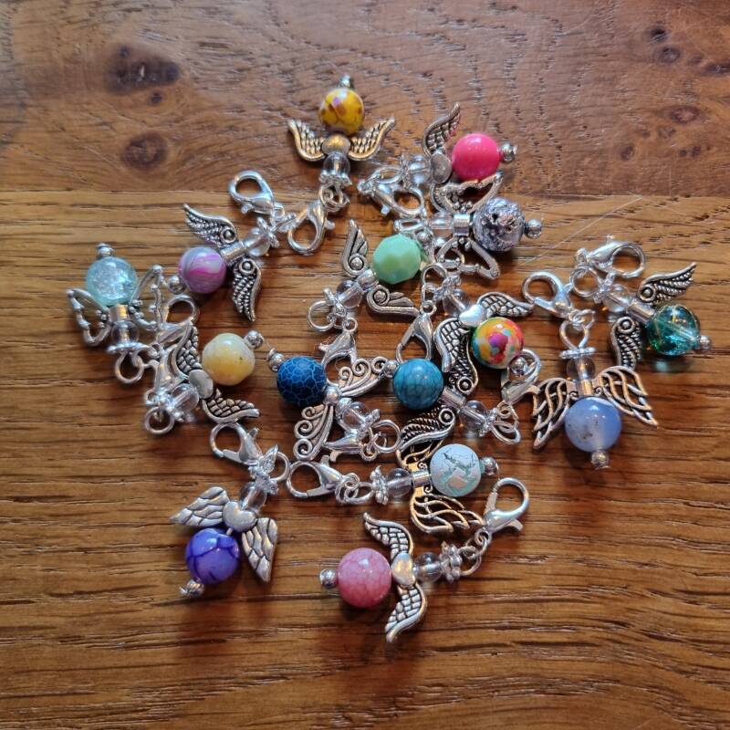 Het karabijn slotje aan deze leuke gelukshangertjes zorgt ervoor dat je ze aan je sleutelbos, rits, ketting of andere mooi plek kunt hangen. We hebben diverse soorten geluksengel hangertjes; bijvoorbeeld met een ronde of druppel kraal, maar ook met een bloemkraal of kralenkap die een jurk is geworden. Ook hebben we limited edition versies zoals een kraal met streepjes, deze komen eenmalig in de shop.